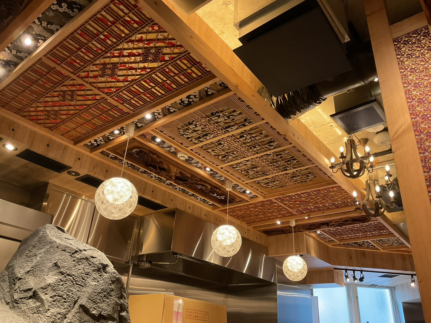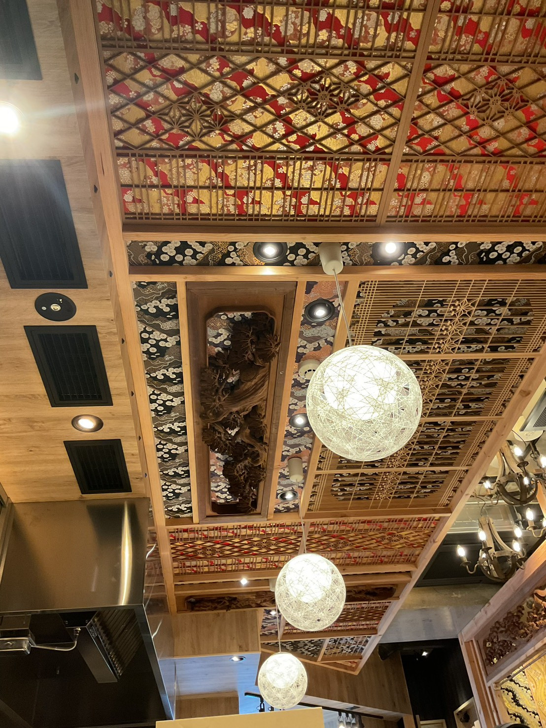 格子状の天井材や和柄の意匠天井を採用。