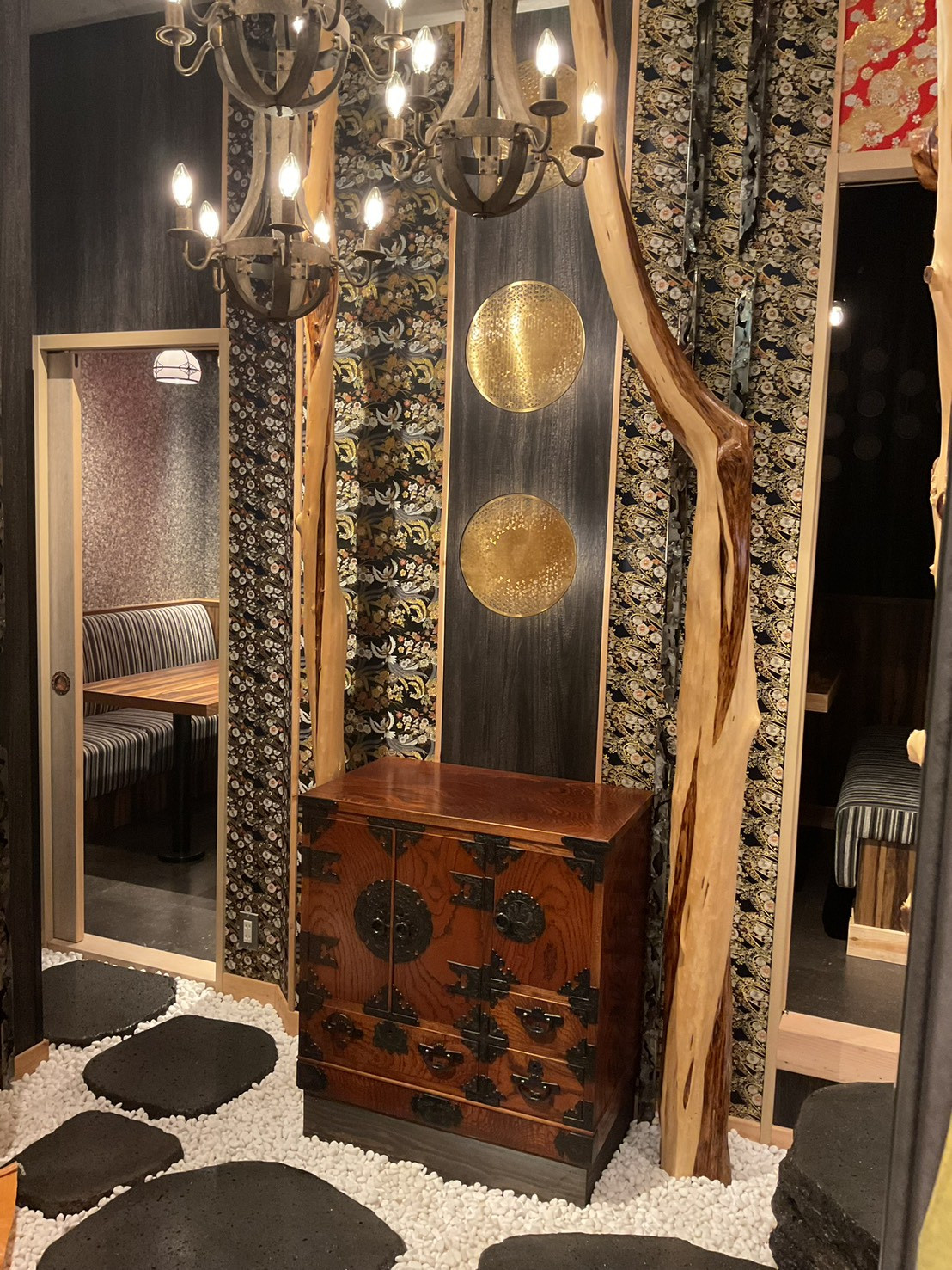 石や木、和柄、金物など多彩な素材をバランスよく組み合わせ、店内全体に統一感のある和モダンの雰囲気を演出。