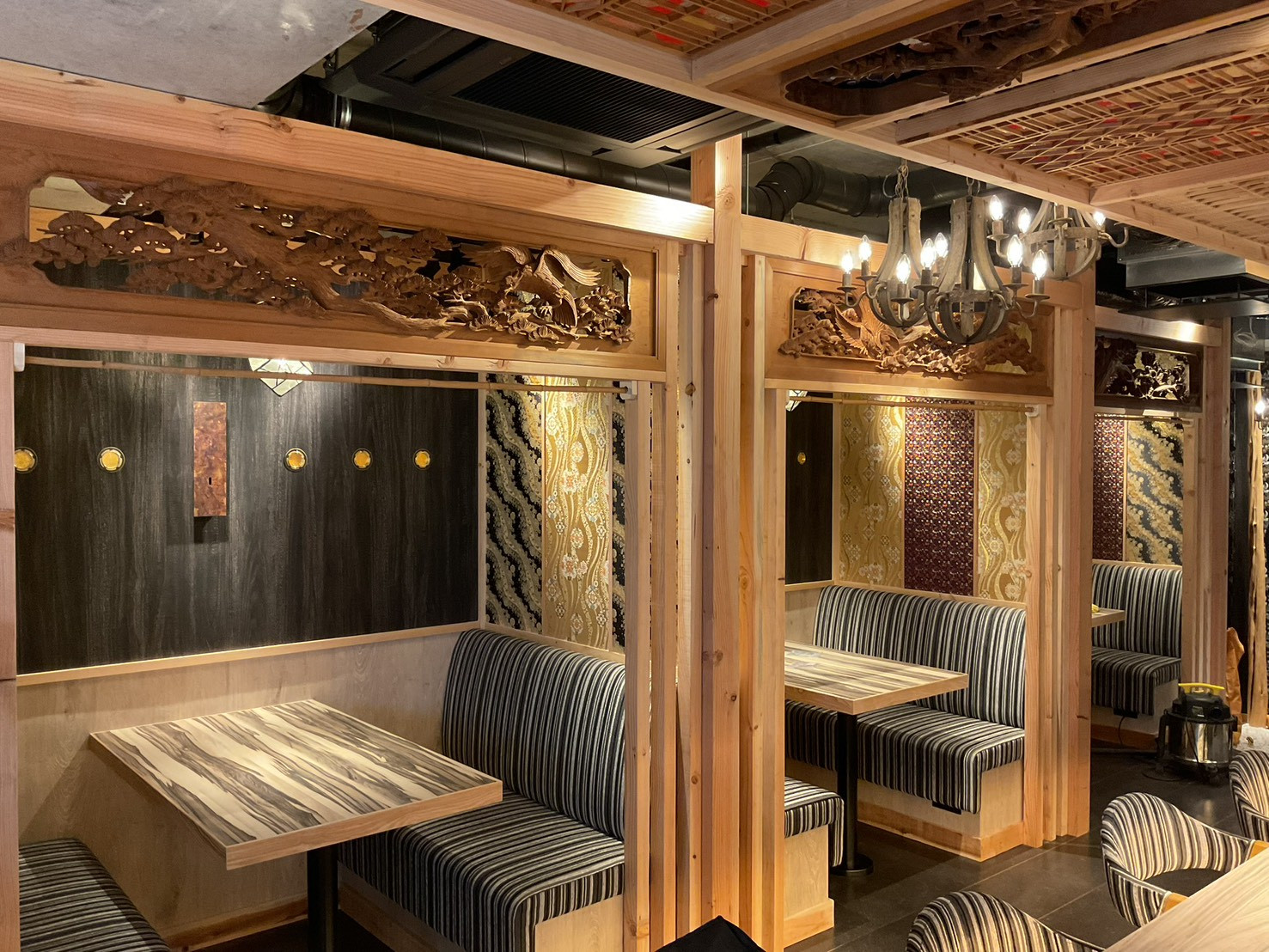 木材や自然木、和柄パネル、欄間彫刻など、伝統的な意匠をバランス良く配置。